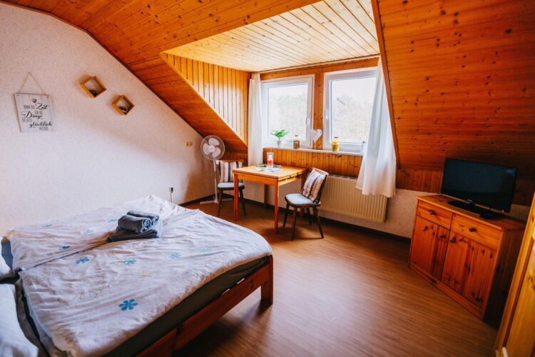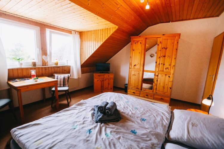 Dieses Doppelzimmer mit ca. 18 m² ist für maximal 2 Personen geeignet. Das Zimmer befindet sich im Obergeschoss. Es ist mit einem Doppelbett, Sat-TV, einem Aufbewahrungsschrank und einer Sitzecke (hoher Tisch und zwei Stühle) ausgestattet.