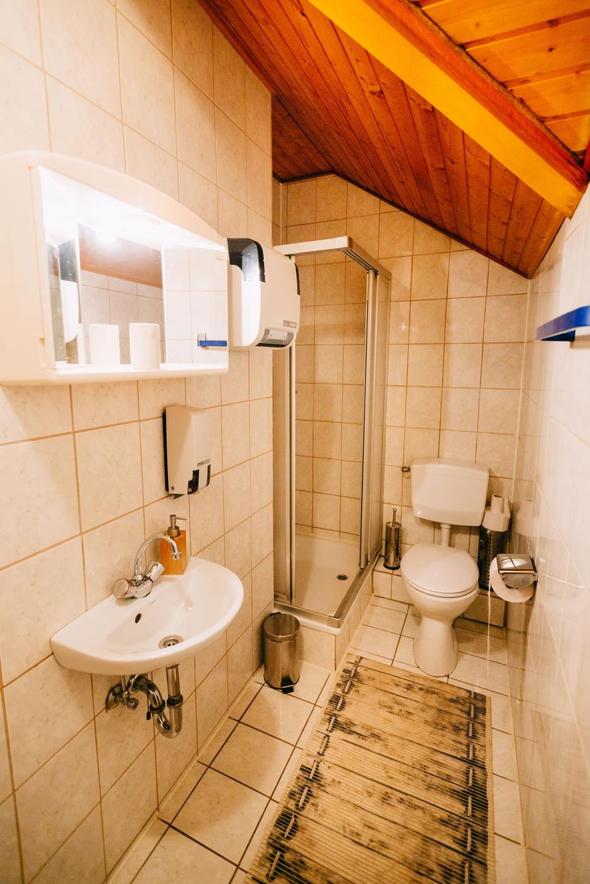 Das Badezimmer ist mit Duschkabine, Waschbecken und WC ausgestattet. Es befindet sich gegenüber auf dem Flur, direkt gegenüber dem Zimmer.