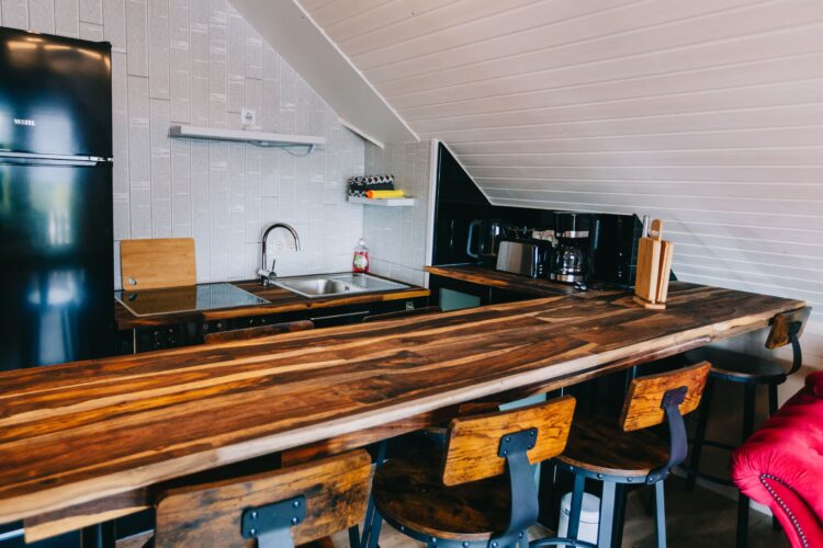 Die Ferienwohnung ist modern eingerichtet. Im Wohnzimmer befinden sich eine praktische, voll ausgestattete Kochnische mit moderner Bar und Barhockern sowie eine gemütliche Sitzecke mit komfortablen Sofas und Sat-TV.