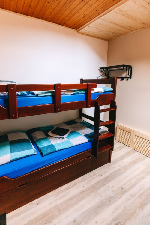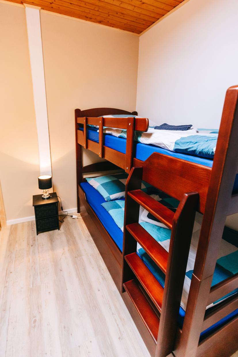 Im geräumigen Schlafzimmer stehen ein Doppelbett und ein großer Kleiderschrank mit viel Stauraum. Das zweite Schlafzimmer ist mit einem Etagenbett ausgestattet, das auch für Erwachsene geeignet ist, sowie mit einem zusätzlichen Ausziehbett. Das luxuriöse Badezimmer verfügt über Whirlpool, Dusche, WC und Haartrockner. Im Flur befindet sich ein zweites WC.