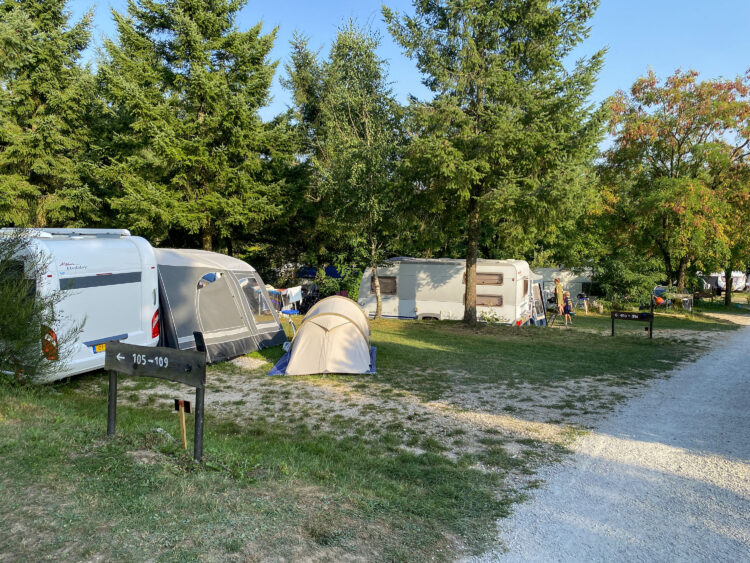 De terraskampeerplaatsen liggen rustig en autoluw en bieden in de meeste gevallen halfschaduw. Het betreft kampeerplaatsen nrs. 100 t/m 131 op de plattegrond.