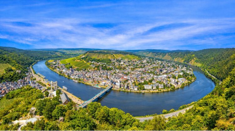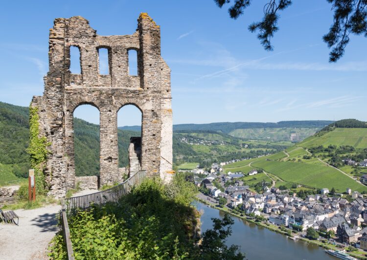 Vom Aussichtspunkt der Grevenburg genießen Sie ein beeindruckendes Panorama über den Fluss, die Weinberge und die Häuser entlang der Mosel.